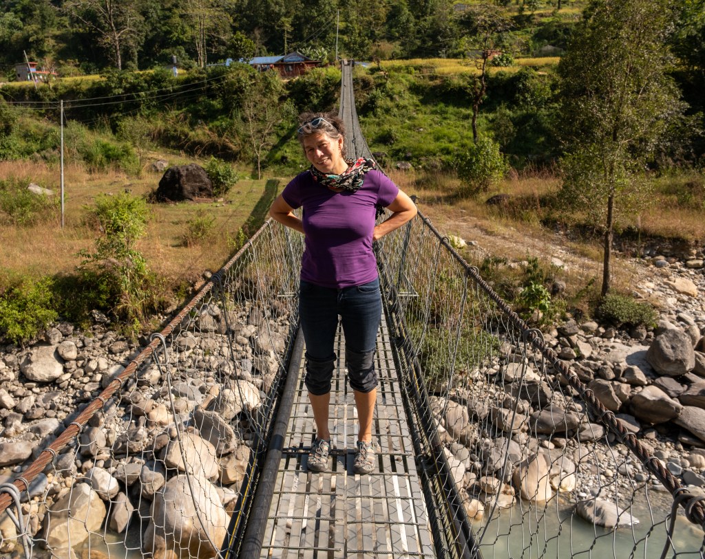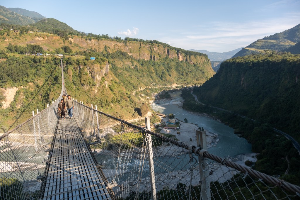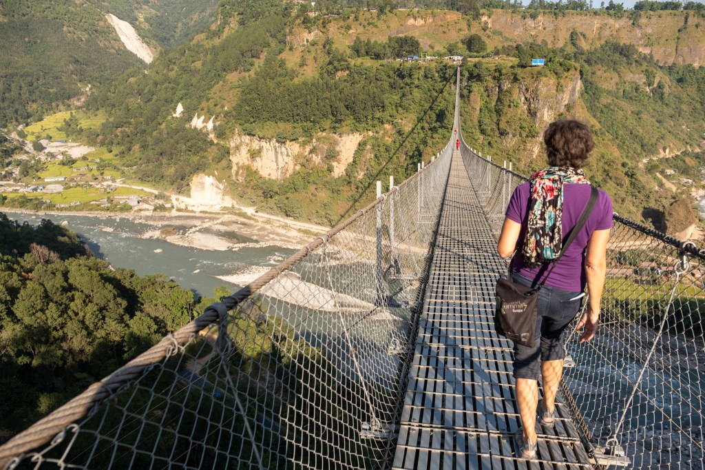 Wir machen einen Stopp und besuchen den Kalika Tempel und gleich daneben die 122m hohe Golden Bridge über den Kali Gandaki. Ein eindrucksvolles Erlebnis, über die Brücke zu gehen, allzu oft hinunter schauen wir dabei nicht.
