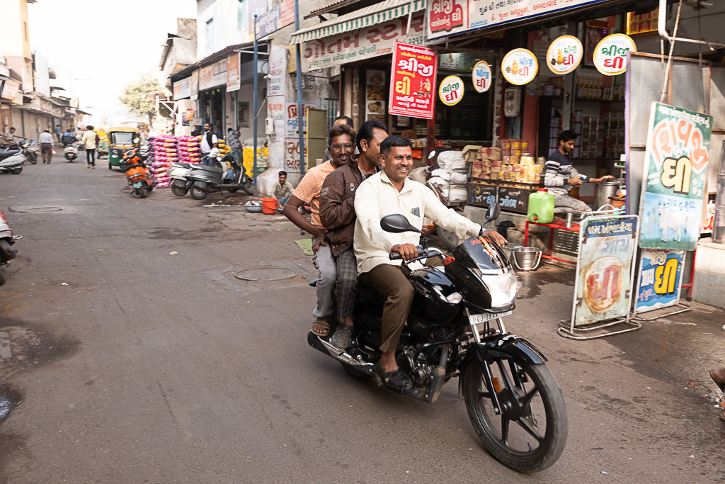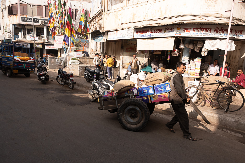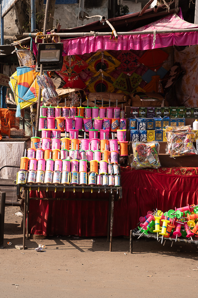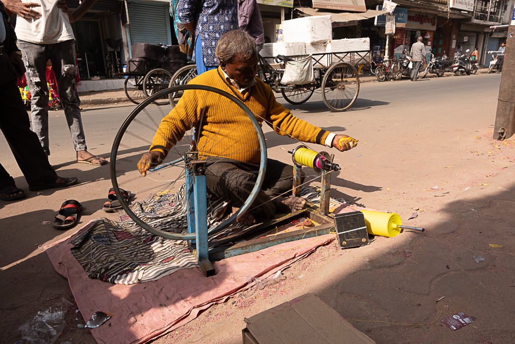In Ahmedabad besuchen wir noch einmal den Markt, um Gewürze und Parfüm zu kaufen. Auf der Straße sehen wir, wie Leinen zum Drachensteigen gefärbt werden.